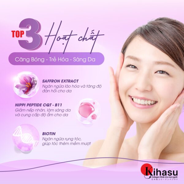 - Trong 1 gói 15ml có : Nippi Peptide CQT – B11 ( Collagen Peptide Nhập khẩu Nhật Bản ) 2500mg, FOS ( Fructooligosaccharides ) 500mg, Nicotinamide mononucleotide ( NMN ) 70g, Vitamin C ( L-Acid Ascorbic ) 50mg, Natri Hyaluronat 5mg, Marine Elastine 5mg, Chiết xuất nhụy hoa nghệ tây ( Crocus Sativus Stigma Extrasct ) 5mg, Chiết xuất cỏ đuôi ngựa ( Equisetum arvense ) 5mg, Biotin 100mcg