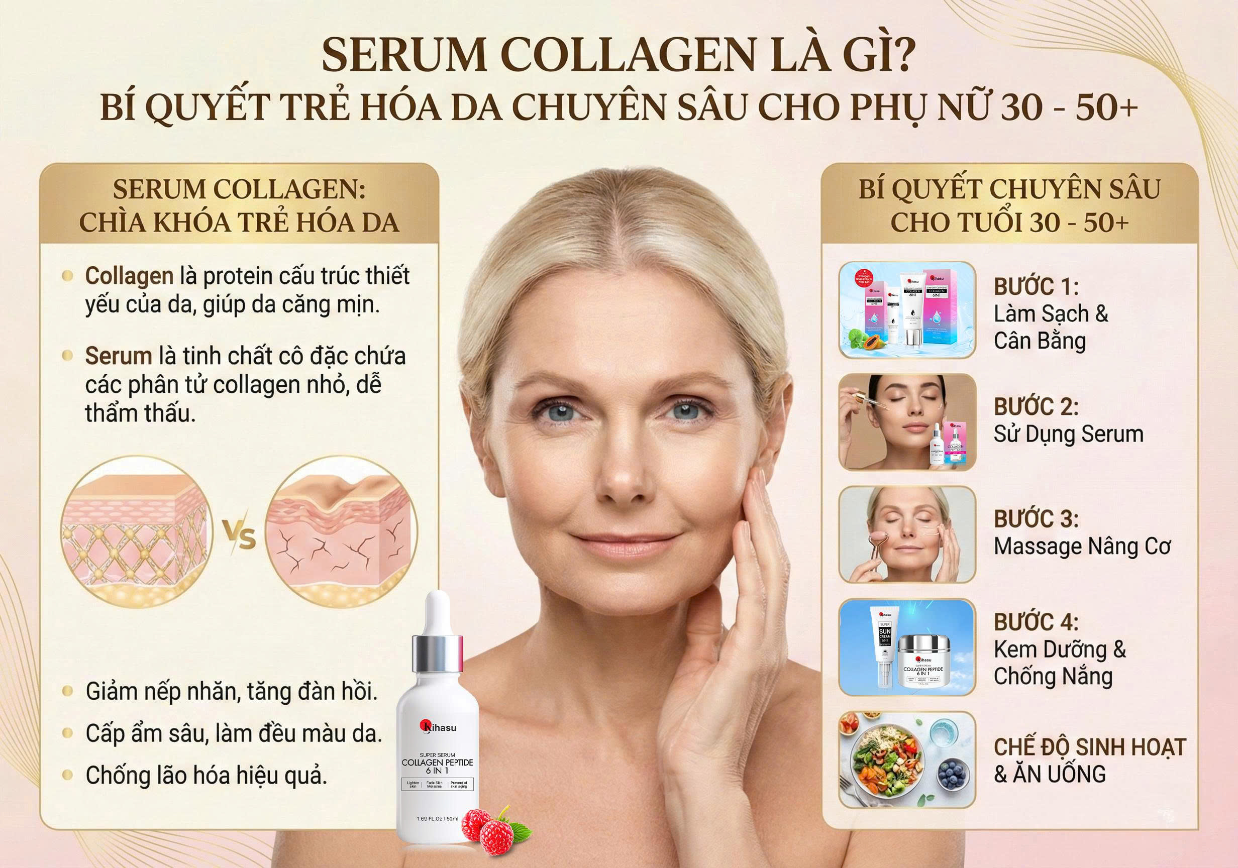 Trả lời: Ở độ tuổi này, làn da bắt đầu thiếu hụt collagen trầm trọng và dễ khô ráp. Bạn nên ưu tiên các loại serum collagen có nguồn gốc từ Nhật Bản, chứa thành phần bổ trợ như Hyaluronic Acid (HA) để cấp ẩm và Vitamin B5 để phục hồi. Serum Collagen KIHASU là một lựa chọn tối ưu nhờ sự kết hợp giữa Collagen Peptide tinh khiết và công nghệ thẩm thấu sâu, phù hợp với cấu trúc da lão hóa của phụ nữ Việt.
