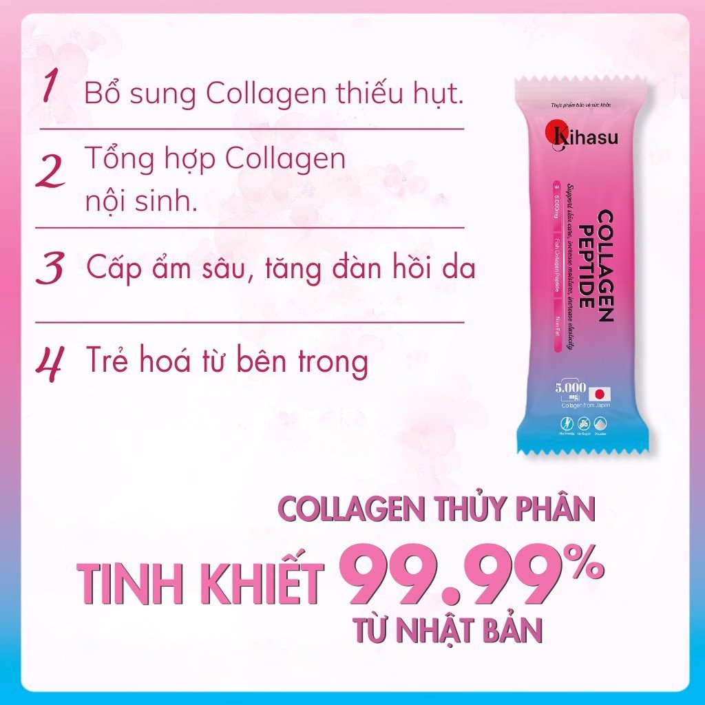 - Da căng mướt, đàn hồi vượt trội : Việc bổ sung Collagen Kihasu giúp tăng sinh collagen tự nhiên dưới da, cải thiện độ đàn hồi và độ ẩm, cho da căng bóng, mịn màng hơn từng ngày.